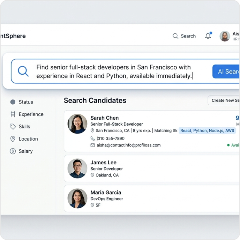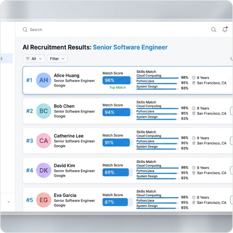 Every candidate is scored on experience depth, skill relevance, and career trajectory — not just keyword overlap. You see the reasoning behind each ranking.