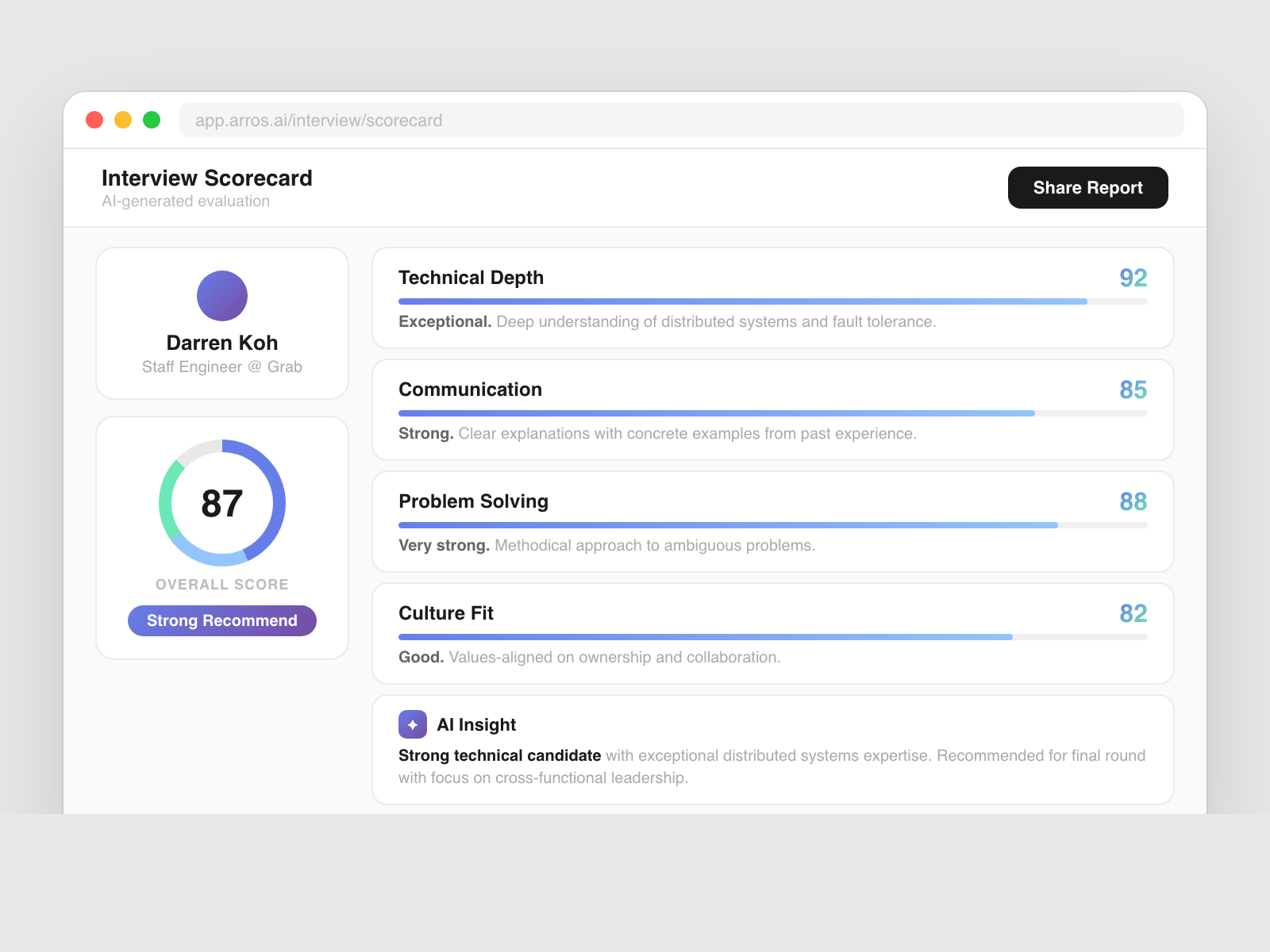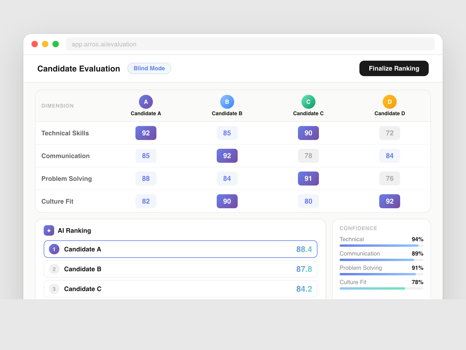 Arros is the hiring infrastructure that replaces gut feel with data — giving your team the precision to make faster offers and the intelligence to know who's worth pursuing.